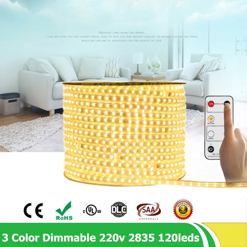 Product Name: 100 M/lote 120leds/m 220v Smd2835 Led Luz De Tira Três Mudança De Cor Pode Ser Escurecido Fita Flexível Luz Ip67 Luzes Da Corda à Prova Dip67 água